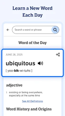 With more than 2 million trusted definitions and synonyms, this English dictionary and thesaurus app for Android is optimized for your mobile device. Improve your English vocabulary, whether you're just starting your learning journey or you're already a word wizard. Install the app for access to definitions and synonyms whenever and wherever you need them — no bulky books necessary. Flip to dark mode to give your eyes a break, or stick to the traditional set-up.