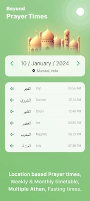 - Automatically calculates precise Namaz (Salat) times based on your location.
