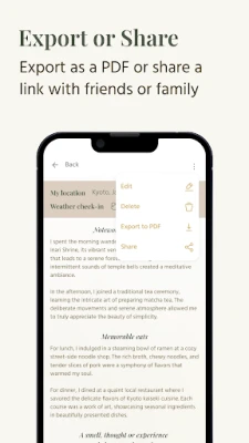 - Share with friends and family: Share your entire diary entry with friends or family so they can feel closer to your adventures.