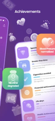While quitting smoking you will receive many great achievements for your health progress, cigarettes avoided, money saved, smoke free time and much more.