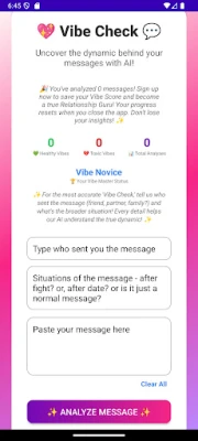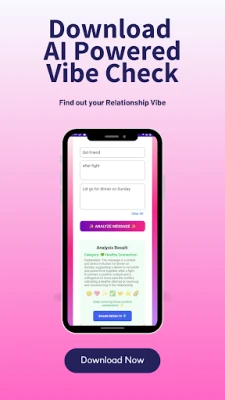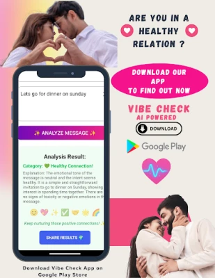 Whether you’re decoding flirty texts, confused by mixed signals, or simply curious about the “tone” of your chats, Vibe Check uses advanced AI to analyze your conversations and give you instant insights into whether your connection feels healthy, toxic, or somewhere in between — all while keeping your privacy 100% safe.